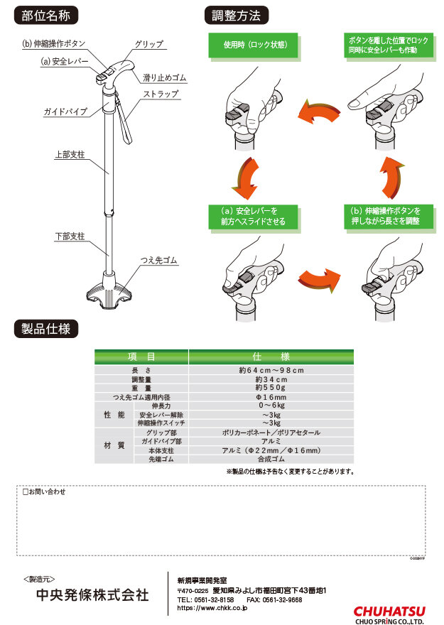 杖の長さを簡単、自由に調整可能な杖です。片手でボタンを押すだけの簡単な操作で好きな長さに素早く長さの変更が可能。椅子からの立ち上り、階段の昇り降り、車の乗り降り時、使わないときの収納時など、用途に合わせてその時に合った好きな長さに切り替えながら使用することにより、行動範囲が広がりより幅広い生活ができるようになります。