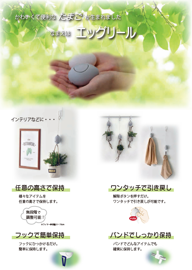 当社のコア技術を活用して、リハビリテーション・医療分野への取り組みを行っております。エッグリールは、乱雑になりがちな点滴等のチューブの長さを就寝時や歩行時など状況に応じてワンタッチで変えることができ、患者様の利便性が上がります。エッグリフターは上腕部のリハビリ用の製品です。保持バンドにより腕の高さを維持し、上腕部・肩の動作を補助します。自立スタンドで、様々な場所に持ち運び置くだけで設置が可能です。